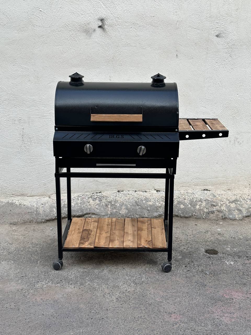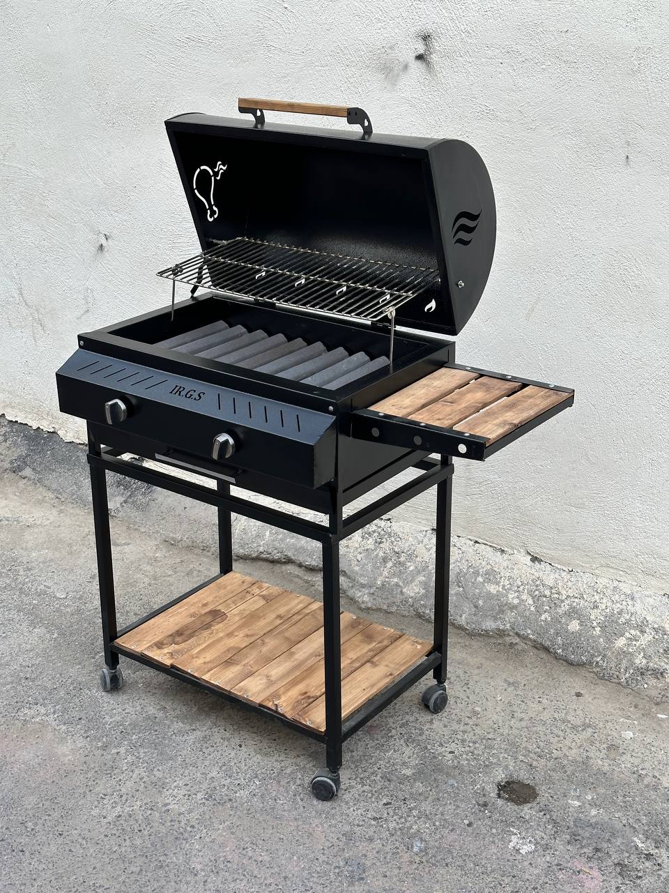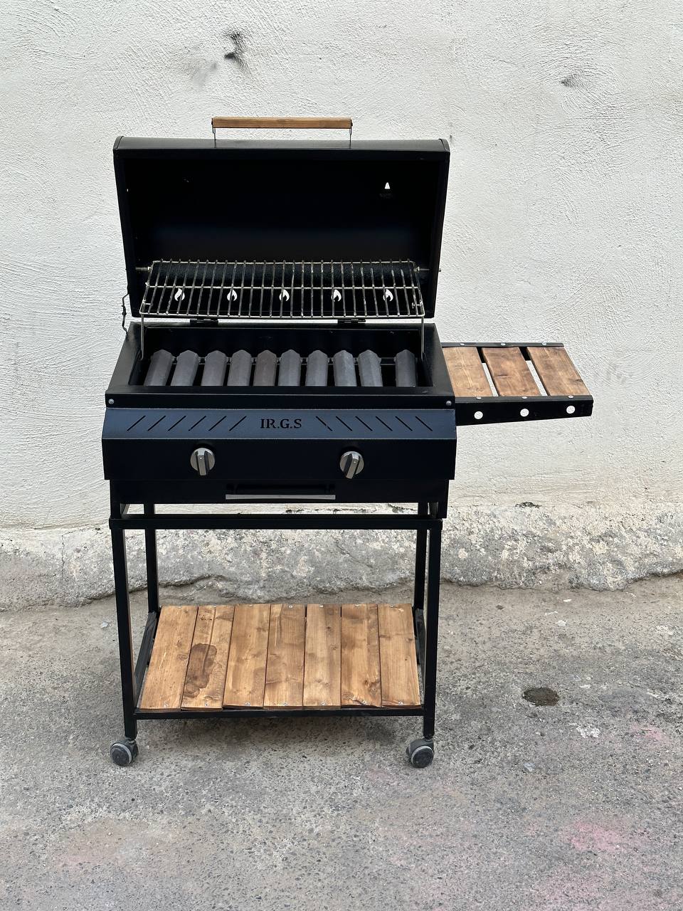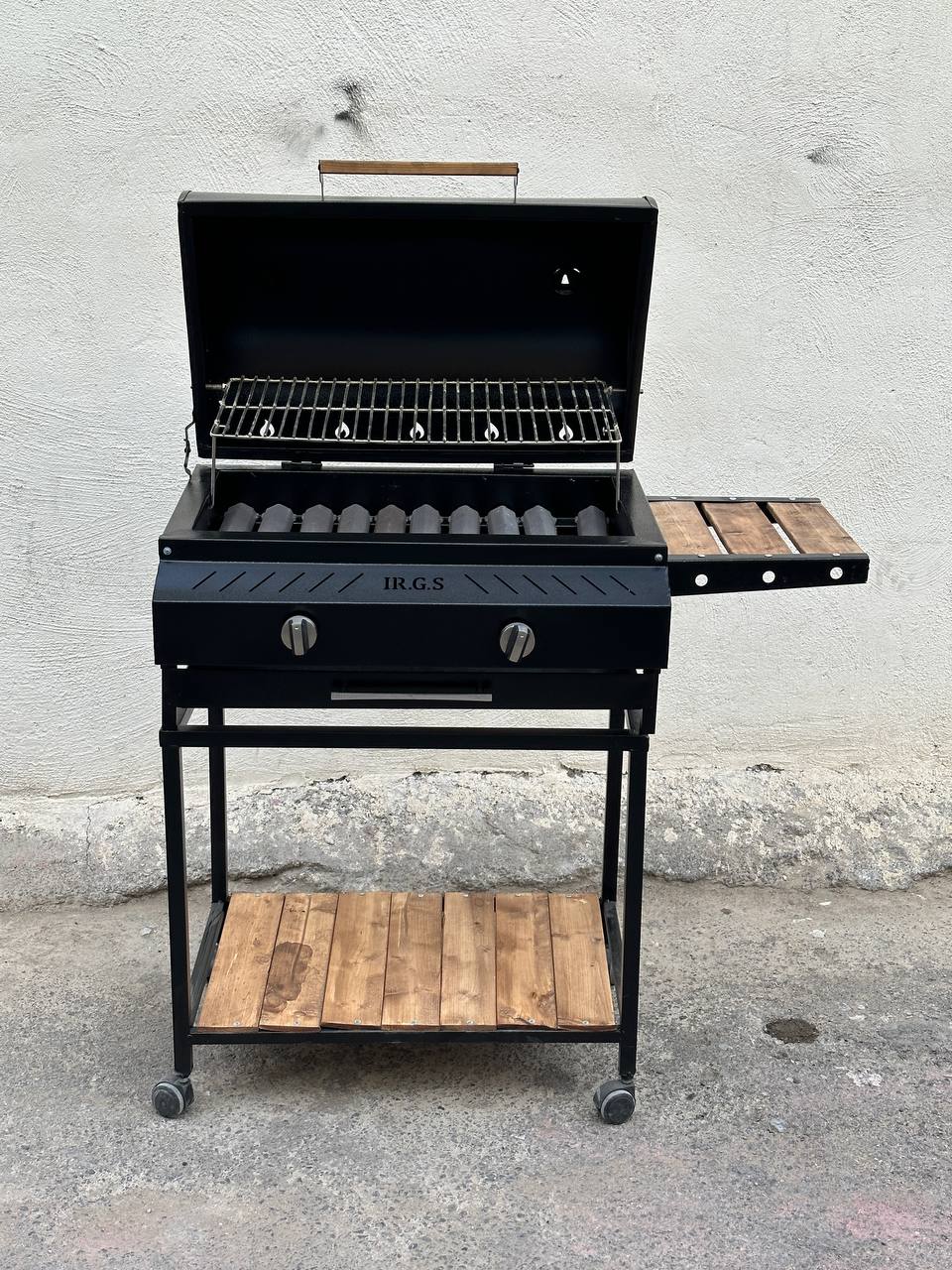 باربیکیو دوگانه گازی زغالی 70 سانتی 10 شعله دهنه 35 سانتی دارای میز کنار توری گریل و استیک 4 چرخ کباب پز دومنظوره گازی زغالی باربیکیومحمد