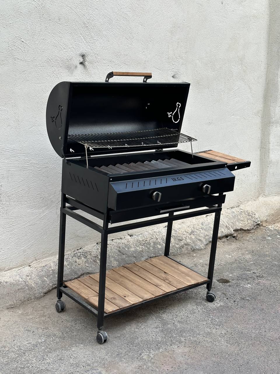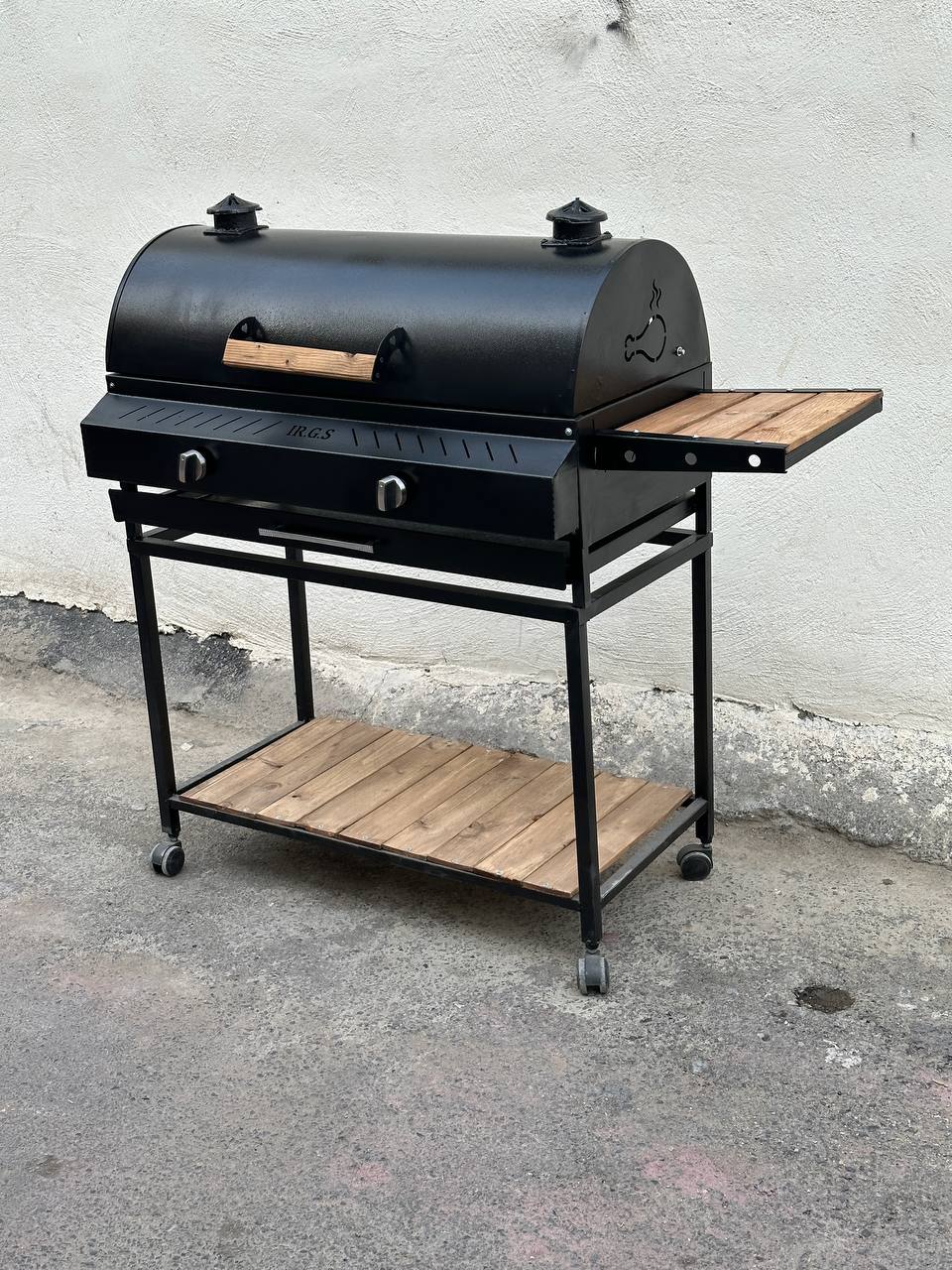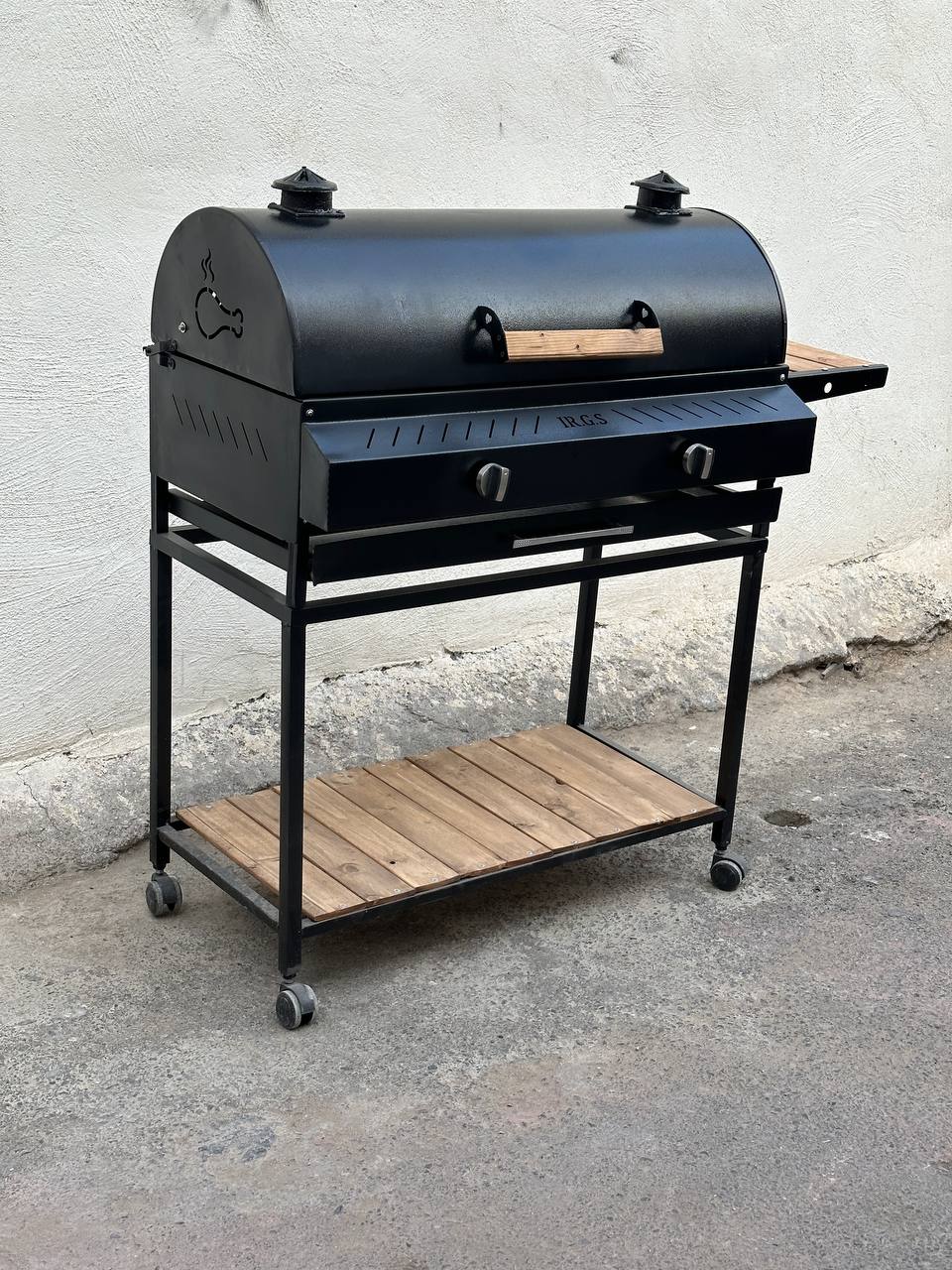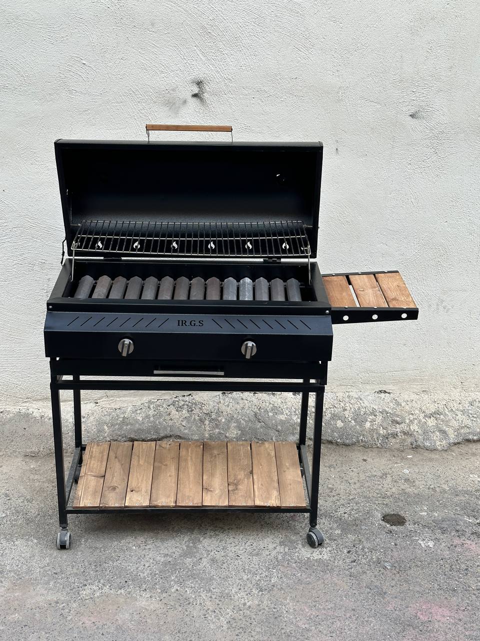 باربیکیو دوگانه گازی زغالی 100 سانتی 15 شعله دهنه 35 سانتی دارای میز کنار توری گریل و استیک 4 چرخ کباب پز دومنظوره گازی زغالی باربیکیومحمد