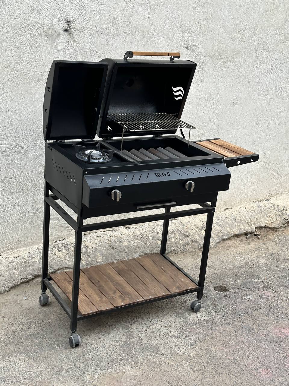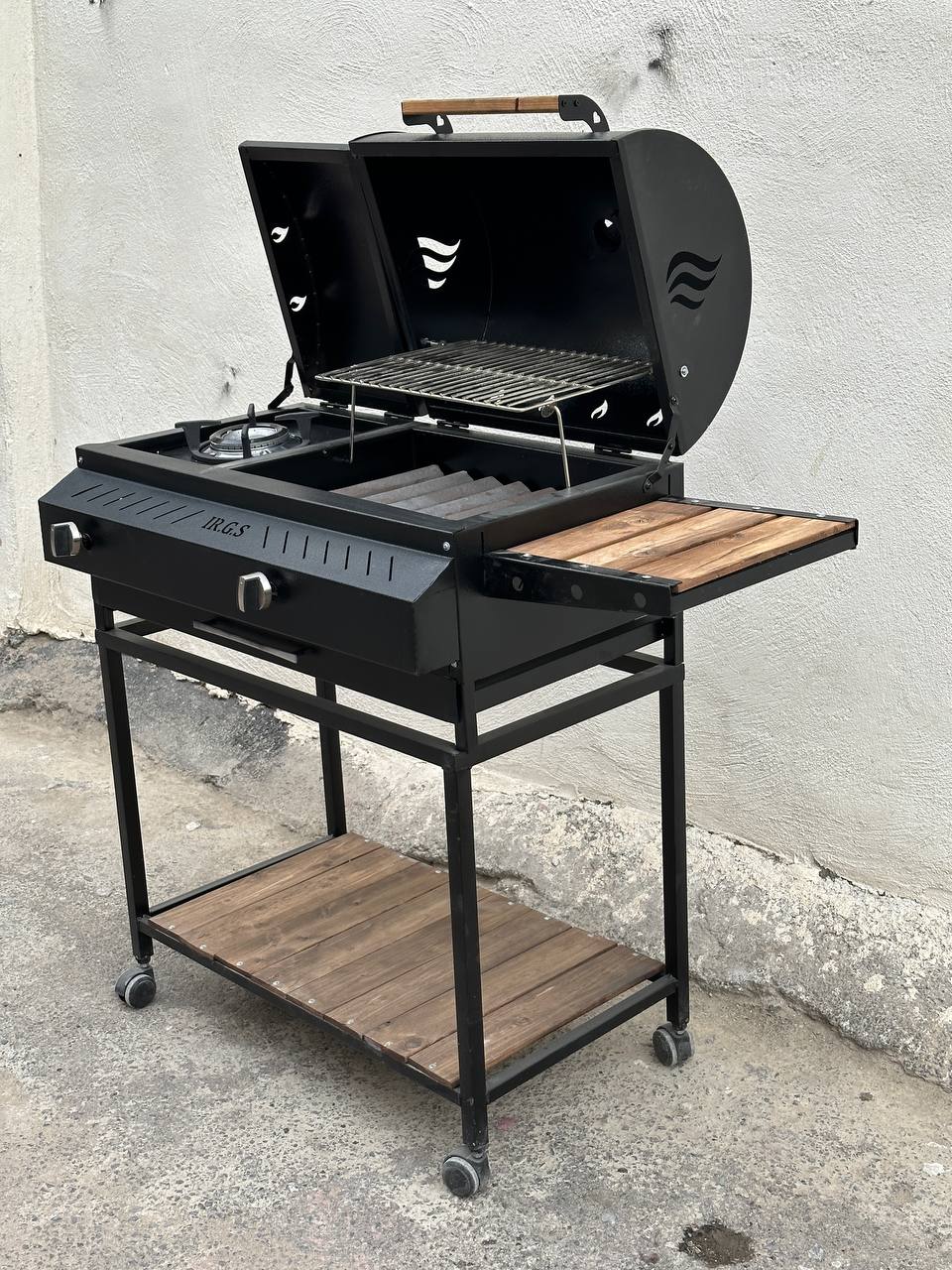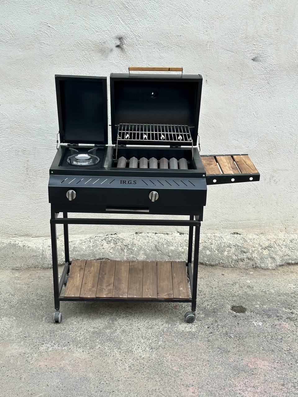 باربیکیو دوگانه گازی زغالی اجاق کنار 80 سانتی 7 شعله دهنه 35 سانتی دارای میز کنار توری گریل و استیک 4 چرخ کباب پز دومنظوره گازی زغالی باربیکیومحمد