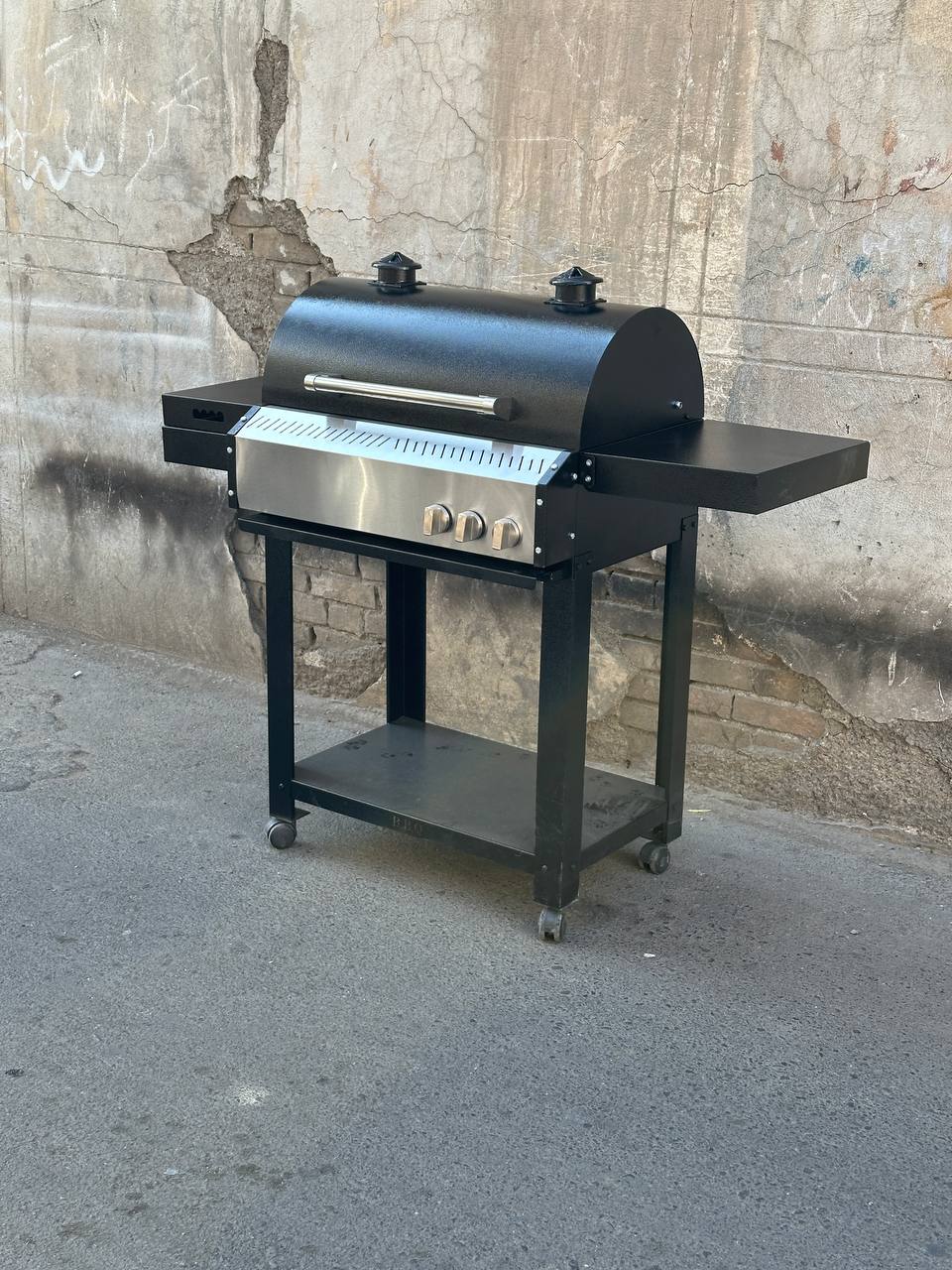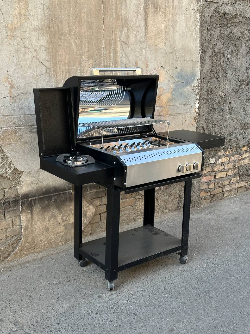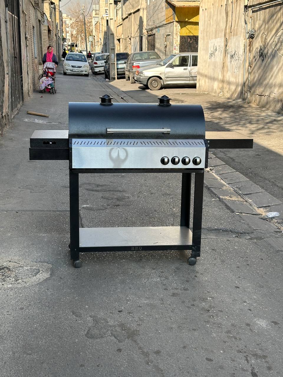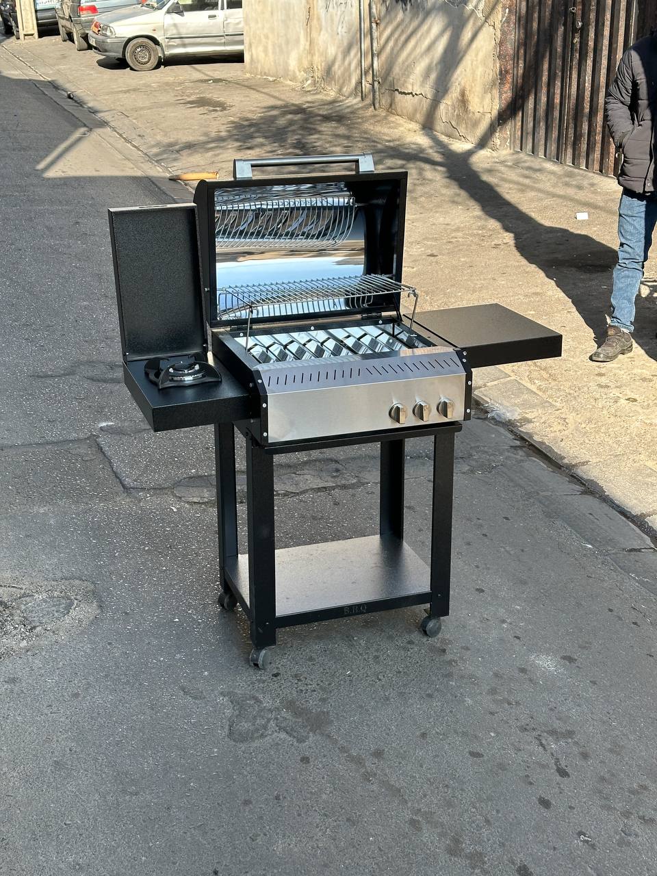 باربیکیو محفظه استیل 304 نگیر ضد زنگ پلوپزدار لوله و محفظه استیل درب دوجداره گریل دار رویه چدنی کباب پز منقل گازی